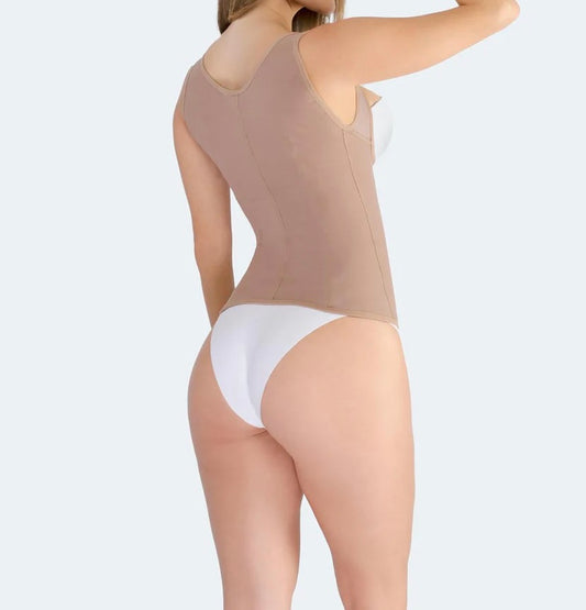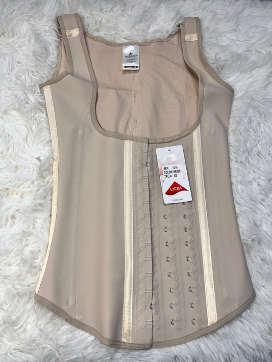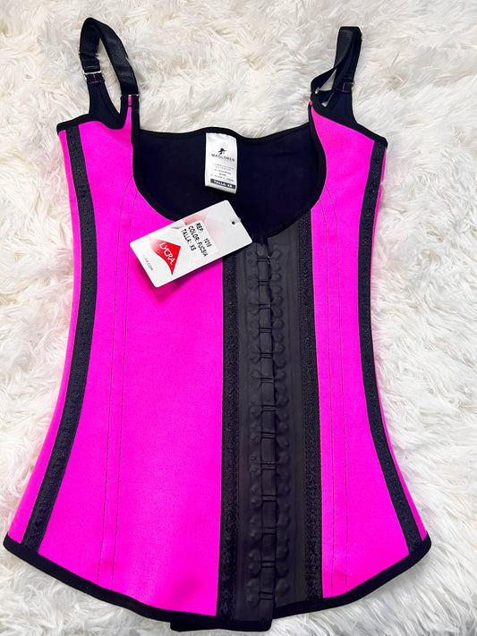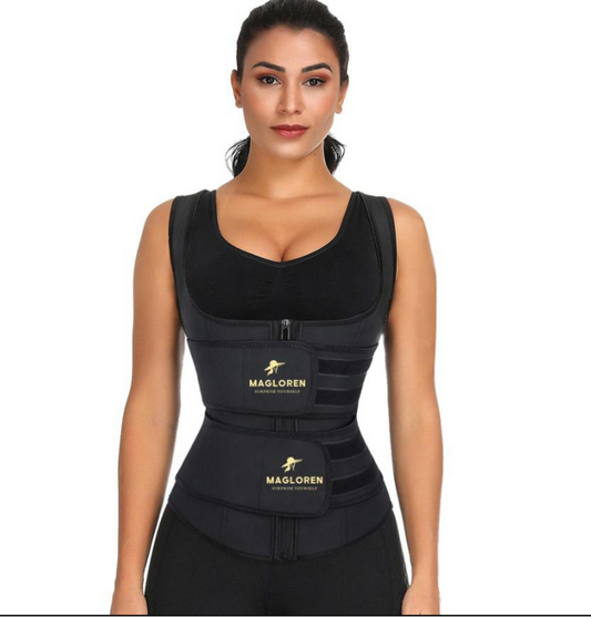 The body waist trainer vest features two Velcro straps and a zipper that closes in...