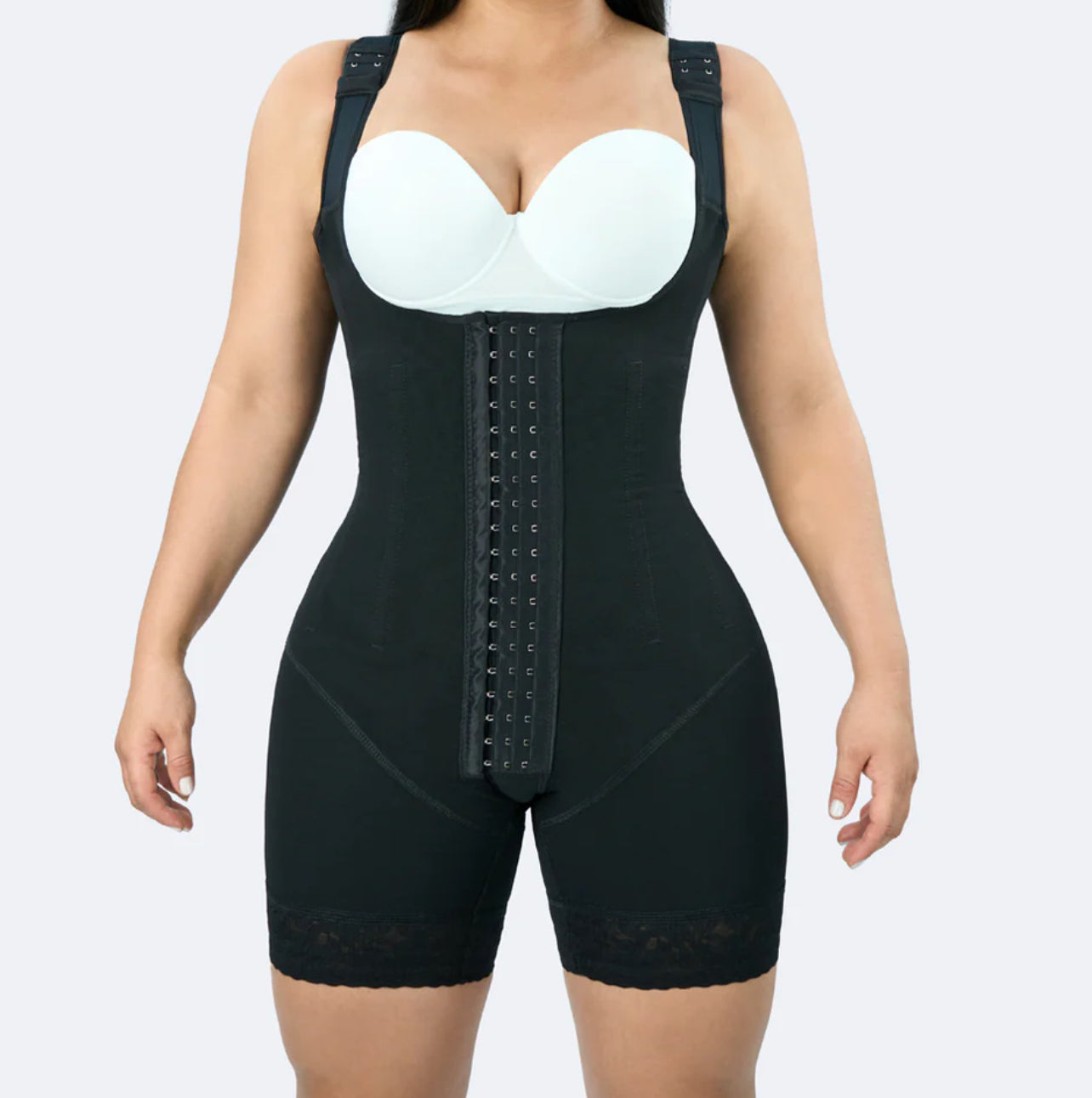 cuenta con 7 varillas para una mayor compresión , 4 adelante y tres detrás . Realce de glúteos perfecto , hombros acolchonados con tres niveles de ajuste, encaje siliconado para que la faja no se enrolle.